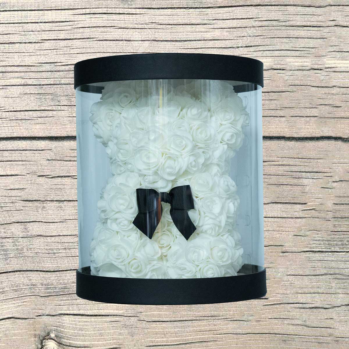Ourson mousse en roses blanches artificielles dans sa boite.